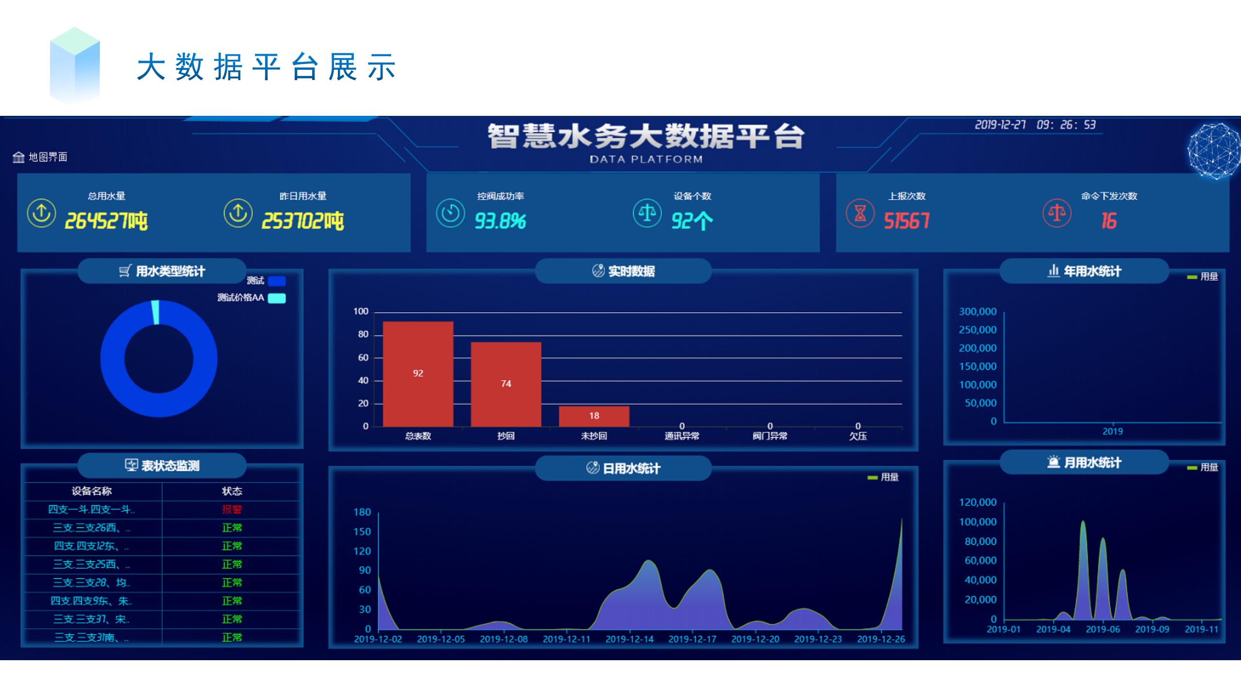 提升水務(wù)管理決策的科學(xué)化水平,利用大數(shù)據(jù)分析能力提升各類(lèi)業(yè)務(wù)應(yīng)用場(chǎng)景的識(shí)別、判斷、管控、執(zhí)行水平,為水安全、水資源、水環(huán)境等決策提供輔助支撐。