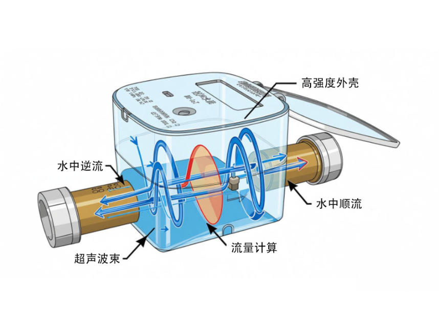 超聲波水表的核心技術原理是“時差法” ,即通過測量超聲波束在水中順流和逆流傳播的時間差來確定水流速度。