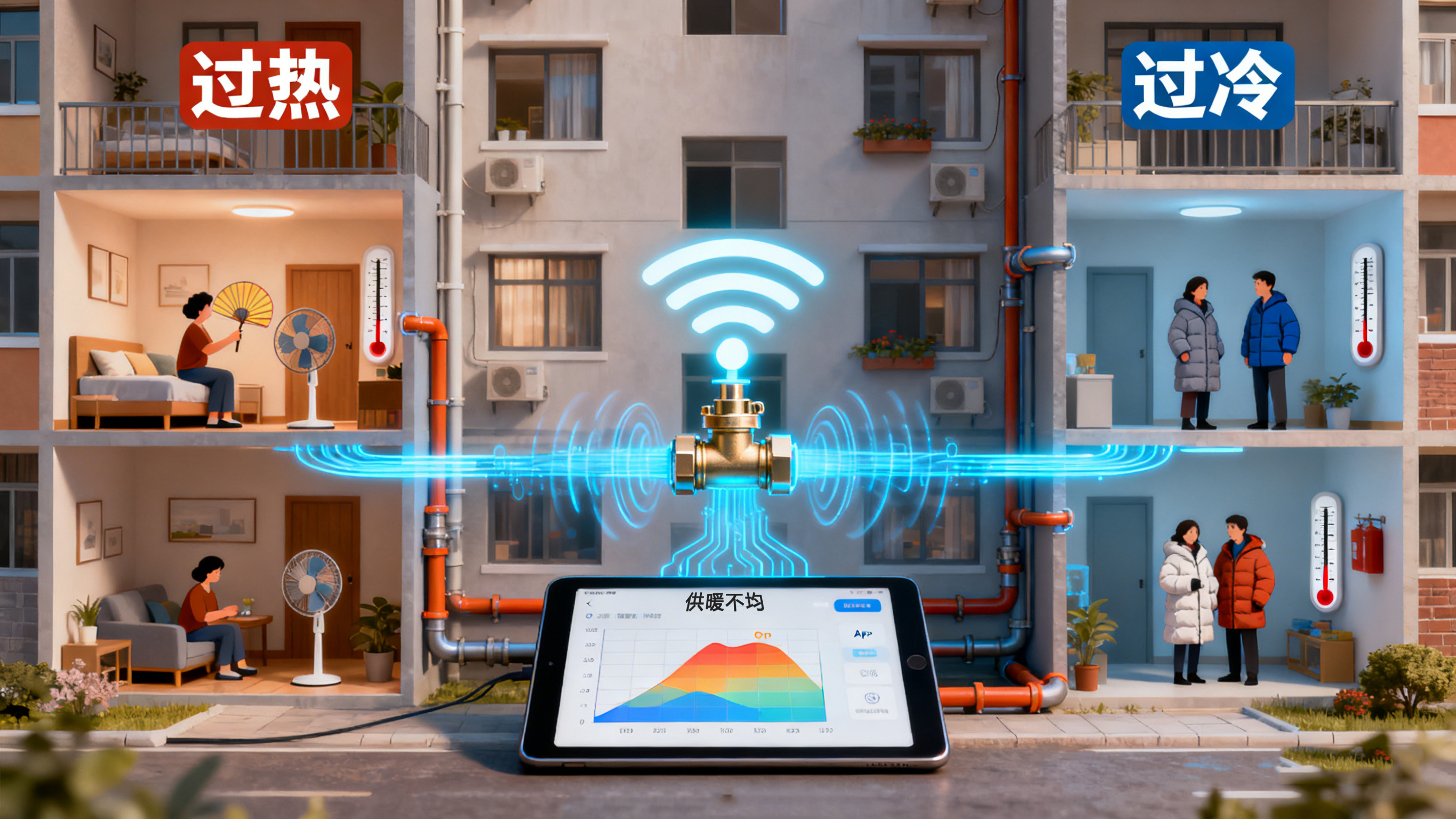 想象一下,我們的供暖管道如同人體的血液循環(huán)系統(tǒng)。熱水就是血液,需要被均勻地輸送到每個(gè)房間(末端,如暖氣片或地暖盤(pán)管)。水利失衡就是指,由于管道長(zhǎng)度、阻力不同等原因,導(dǎo)致離熱源(鍋爐或換熱站)近的“近端”循環(huán)過(guò)快,水流過(guò)大,房間過(guò)熱;而離熱源遠(yuǎn)的“遠(yuǎn)端”循環(huán)不暢,水流過(guò)小,房間冰冷。這不僅造成了用戶體驗(yàn)差,更導(dǎo)致了大量的能源浪費(fèi)。
