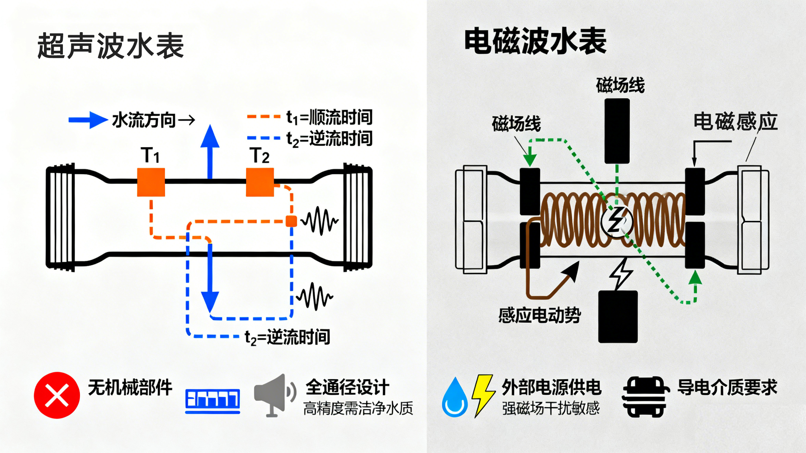 | 測量原理 | 法拉第電磁感應(yīng) | 超聲波時差法 |