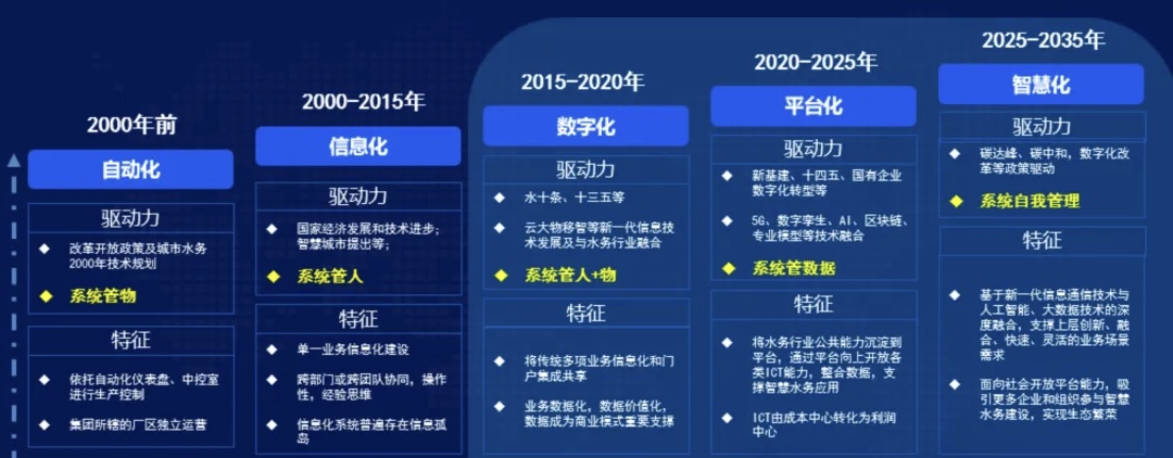 從目前智慧水務(wù)行業(yè)整體發(fā)展現(xiàn)狀,智慧水務(wù)共分為五個階段:自動化階段、信息化階段、數(shù)字化階段、平臺化階段、智慧化階段。